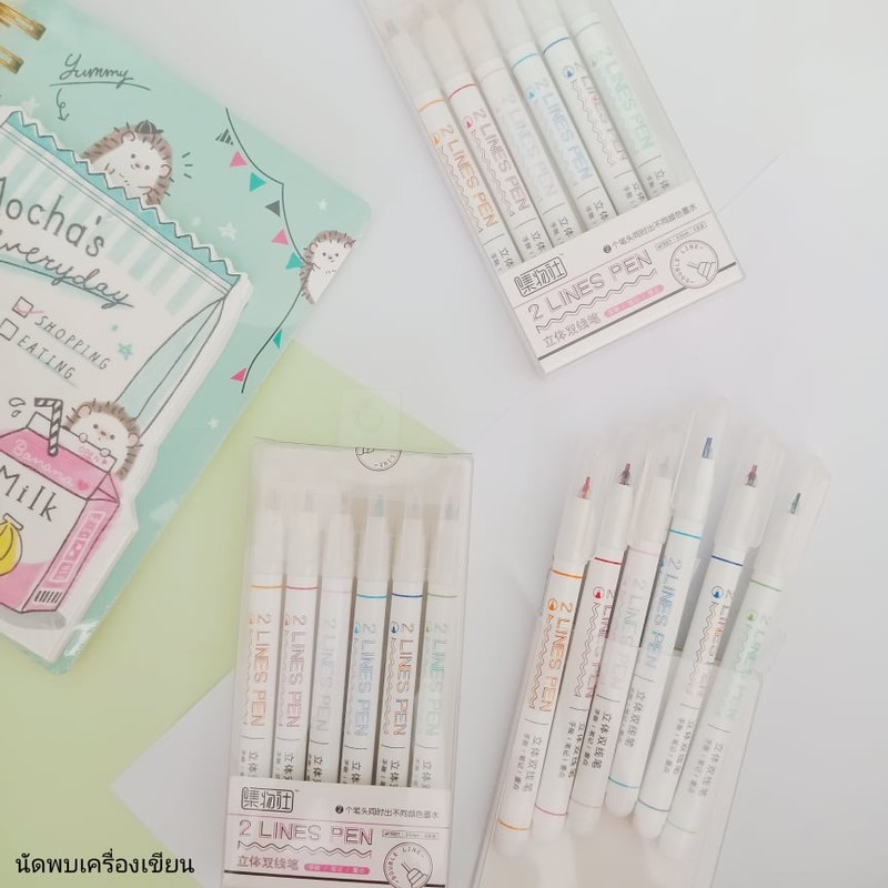 "description": "<p>2Lines Pen</p>\r\n<ul>\r\n<li>ปากกา 2 เส้น</li>\r\n<li>มีให้เลือก 6 สี</li>\r\n<li>1 set มี 6 ด้าม</li>\r\n<li>เหมาะกับการตกแต่งสมุดมากกกก</li>\r\n</ul>",
