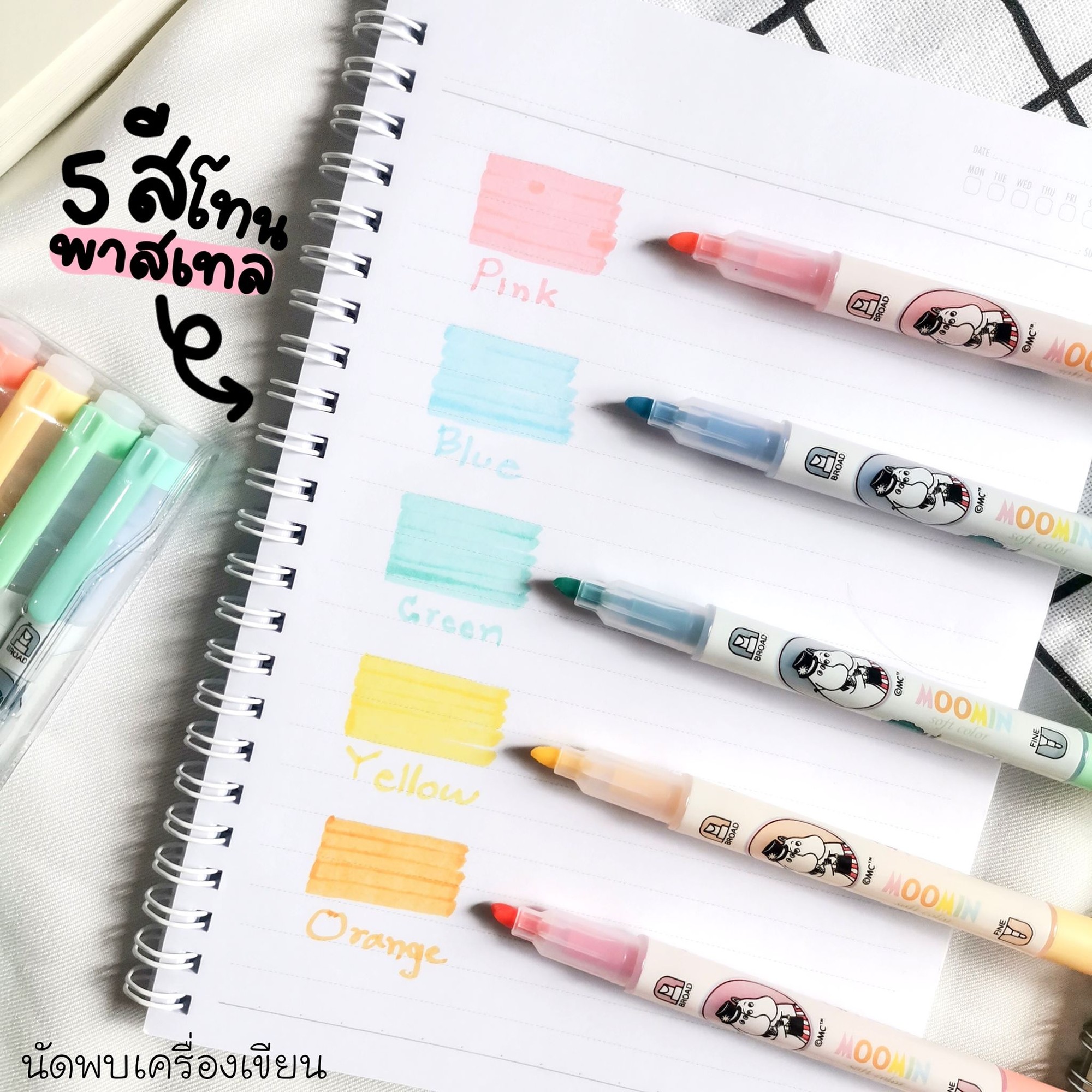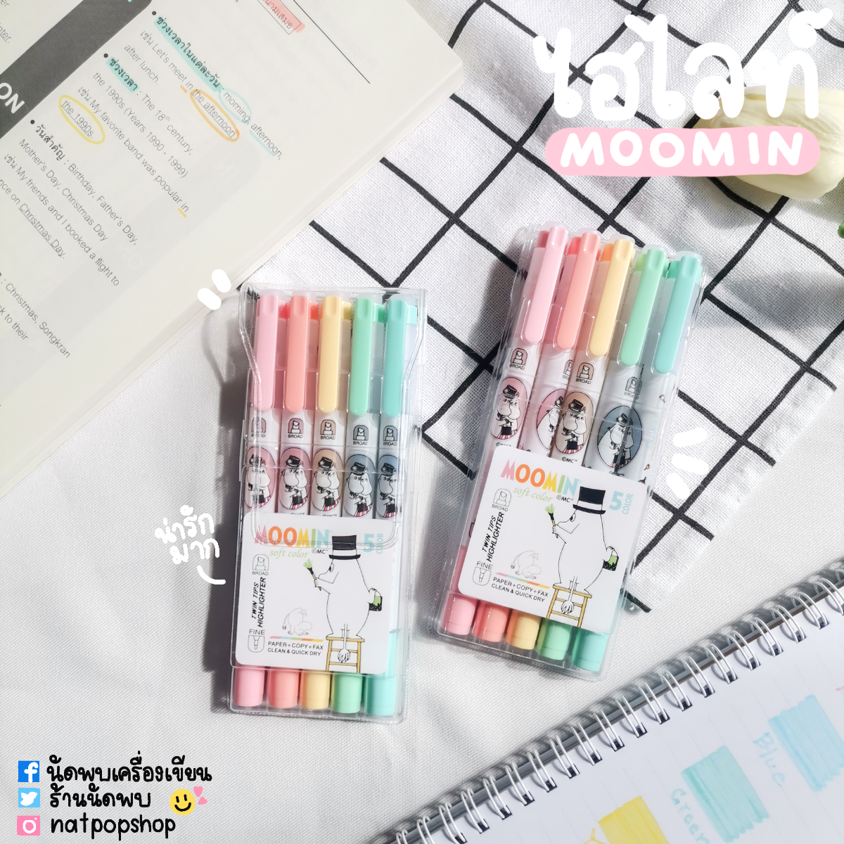"description": "<p>Highlighter Moomin Set 5 Colors</p>\r\n<ul>\r\n<li>ปากกาเน้นข้อความสีพาสเทล ลายมูมิน</li>\r\n<li>1 set มี 5 สี</li>\r\n</ul>",